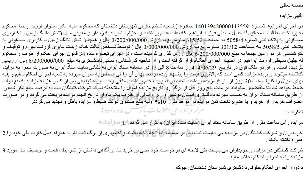 در اجرای اجراییه شماره 140139420000113559 صادره ازشعبه ششم حقوقی شهرستان دشتستان که محکوم علیه: نادر استوار فرزند رضا محکوم به پرداخت مطالبات محکوم له جلیل سبطی فرزند ابراهیم که بعلت عدم پرداخت و اعزام نامبرده به زندان و معرفی مال (شش دانگ زمین با کاربری مسکونی به پلاک ثبتی شماره 5058/4 به مساحت 315/53 مترمربع به ارزش 3/200/000/000 ریال و همچنین شش دانگ زمین با کاربری مسکونی به پلاک ثبتی 5058/5 به مساحت 301/12 مترمربع به ارزش 3/000/000/000 ریال ) توسط شخص ثالث خانم زینت پاپری فرزند بهرام و توقیف و کارشناسی هر دو زمین جمعا به مبلغ 6/200/000/000 ریال ارزش گذاری گردیده است ، در اجرای تبصره ماده 34 قانون اجرای احکام از طرف : محکوم له جلیل سبطی فرزند ابراهیم در اختیار اجرای احکام قرار گرفته است و از ناحیه کارشناس رسمی دادگستری به مبلغ 6/200/000/000 ریال ارزیابی گردیده است، و هر دو ملک فوق در تاریخ 1404/06/29از ساعت 8 الی 12 در سامانه ستاد ایران به نشانی سایت ستاد ایران به صورت مجزا به مزایده گذاشته میشوند و برنده مزایده کسی است که بالاترین قیمت را پیشنهاد و ده درصد بهای آن را فی المجلس به عنوان سپرده به شعبه اجرای احکام تسلیم و بقیه بهای اموال را ظرف مدت 30 روز از تاریخ مزایده پرداخت نماید در صورت عدم پرداخت مابقی وجه سپرده تودیعی پس از کسر هزینه مزایده به نفع دولت ضبط خواهد شد لذا متقاضیان میتوانند در مدت پنج روز قبل از برگذاری تاریخ مزایده اموال را ملاحظه نمایند شرکت کنندگان باید ده درصد مبلغ ذکر شده را از طریق سامانه ستاد ایران به حساب سپرده دادگستری استان بوشهر واریز والباقی آن ظرف یک ماه از تاریخ انجام مزایده دریافت می گردد و در صورت انصراف خریدار از خرید و یا عدم پرداخت ثمن مزایده در موعد مقرر 10% اولیه بنفع صندوق دولت ضبط و مزایده باطل و تجدید می گردد.