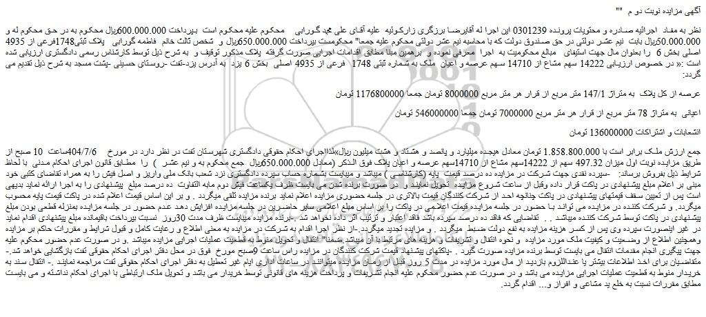 جمع ارزش ملک برابر است با 1.858.800.000 تومان معادل هیجده میلیارد و پانصد و هشتاد و هشت میلیون ریال»لذااجرای احکام حقوقی دادگستری شهرستان تفت در نظر دارد در مورخ 404/7/6ساعت 10 صبح از طریق مزایده نوبت اول میزان 497.32 سهم از 14222سهم مشاع از 14710سهم عرصه و اعیان پلاک فوق الذکر (معادل 650.000.000ریال جمع محکوم به و نیم عشر ) را مطابق قانون اجرای احکام مدنی با لحاظ شرایط ذیل بفروش برساند: -سپرده نقدی جهت شرکت در مزایده ده درصد قیمت پایه (کارشناسی ) میباشد و میبایست بشماره حساب سپرده دادگستری نزد شعب بانک ملی واریز و اصل فیش را به همراه تقاضای کتبی خود مبنی بر اعلام مبلغ پیشنهادی در پاکت قرار داده وقبل از ساعت شروع مزایده تحویل نمایند و در صورت برنده شدن می بایست ظرف یکساعت فیش دوم مابه التفاوت ده درصد مبلغ پیشنهادی را به اجرا ارائه نماید بدیهی است پس از تعیین سقف قیمتهای پیشنهادی در پاکت چنانچه احد از شرکت کنندگان قیمت بالاتری در جلسه حضوری مزایده اعلام نماید برنده مزایده تلقی میگردد . و بر این اساس قیمت اعلام شده در پاکت قیمت پایه محسوب میگردد. و شرکت کننده در مزایده می تواند با حضور در جلسه مزایده قیمت اعلامی در پاکت را بر اساس مبلغ اعلامی سایر حاضرین در جلسه مزایده افزایش دهد عدم حضور در جلسه مزایده بمنزله قطعی بودن مبلغ پیشنهادی در پاکت توسط شرکت کننده میباشد . . تقاضایی که فاقد ده درصد سپرده باشد فاقد اعتبار و ترتیب اثر داده نخواهد شد .-برنده مزایده میبایست ظرف مدت 30روز نسبت بپرداخت باقیمانده مبلغ پیشنهادی اقدام نماید در غیر اینصورت سپرده وی پس از کسر هزینه مزایده به نفع دولت ضبط میگردد . و مزایده تجدید میگردد.-از نظر اجرا اقدام به شرکت در مزایده به معنی اطلاع و رعایت کامل و قبول شرایط و مقررات حاکم بر مزایده وهمچنین اطلاع از وضعیت و کیفیت ملک مورد مزایده و نحوه انتقال و تشریفات و هزینه های مرتبط با آن میباشد.ضمنا" انتقال و تحویل منوط به قطعیت عملیات اجرایی مزایده میباشد .و در صورت عدم حضور محکوم علیه جهت پیگیری انجام مقدمات انتقال می بایست توسط برنده مزایده صورت گیرد . -پاکتهای پیشنهاد قیمت شرکت کنندگان در مزایده راس ساعت 9صبح مورخ فوق در محل دفتر اجرای احکام حقوقی تفت بازگشایی خواهد شد.-متقاضیان برای اخذ اطلاعات بیشتر یا عنداللزوم بازدید از مال مورد مزایده در مدت 5 روز قبل از زمان مزایده میتوانند در ساعات اداری ایام غیر تعطیل به دفتر اجرای احکام حقوقی تفت مراجعه نمایند .- انتقال سند به خریدار منوط به قطعیت عملیات اجرایی مزایده می باشد و در صورت عدم حضور محکوم علیه انجام تشریفات و پرداخت هزینه های قانونی توسط خریدار می باشد و تحویل ملک ارتباطی با اجرای احکام نداشته و می بایست مطابق مقررات نسبت به خلع ید مشاعی و افراز و... اقدام گردد.
