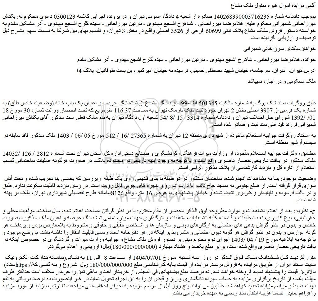 بموجب دادنامه شماره 140268390003716235 صادره از شعبه 4 دادگاه عمومی تهران و در پرونده اجرایی کلاسه 0300123 دعوی محکوم له: بکتاش میرزاخانی شمیرانی محکوم علیه: غلامرضا میرزاخانی - شاهرخ اشجع مهدوی - نازنین میرزاخانی - سیده گلرخ اشجع مهدوی - آذر مشکین مقدم به خواسته دستور فروش ملک مشاع پلاک ثبتی 60699 فرعی از 3526 اصلی واقع در بخش 3 تهران، و تقسیم بهای بین شرکا به نسبت سهم بشرح ذیل توصیف و ارزیابی گردیده است