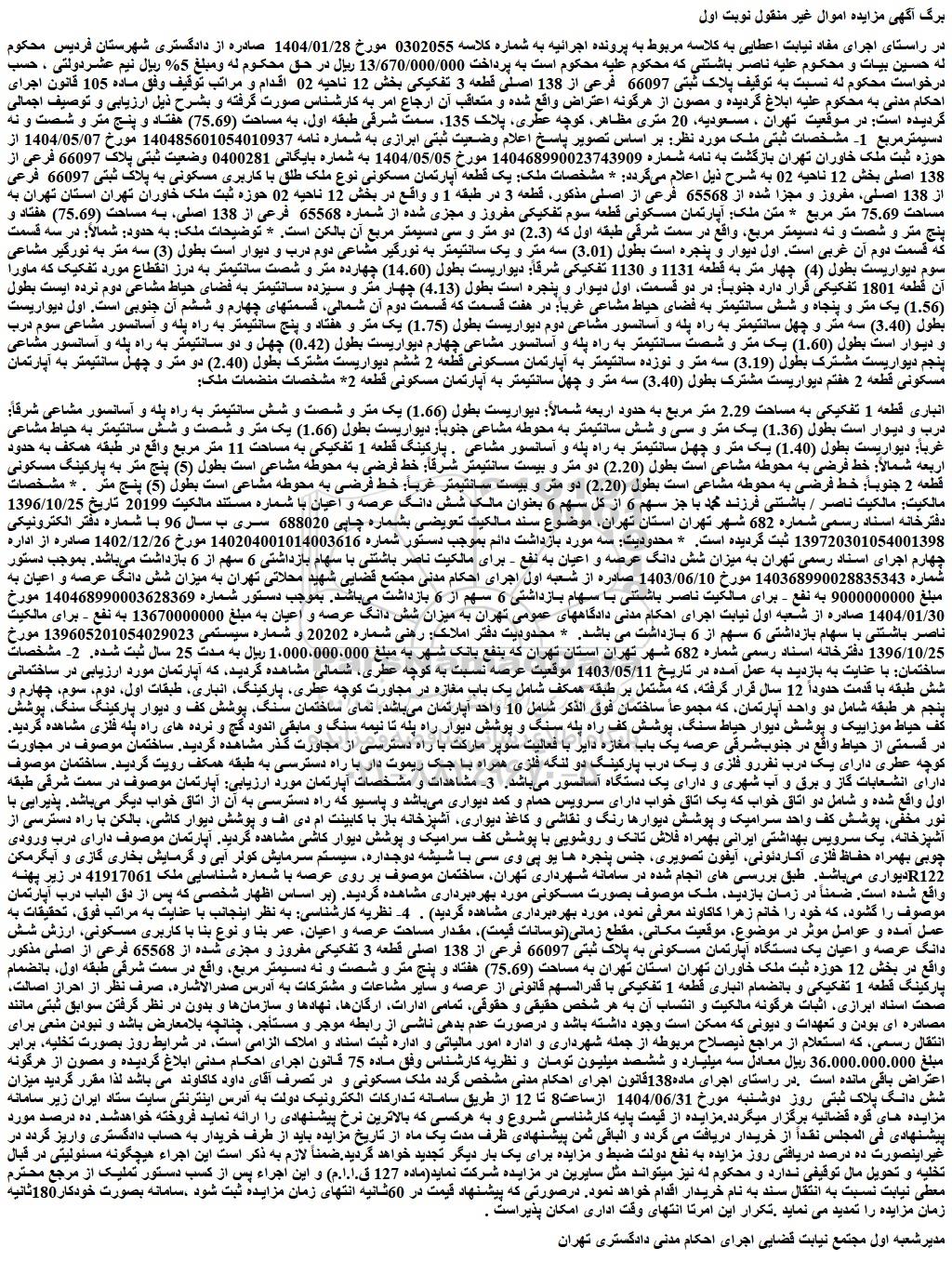 در راستای اجرای مفاد نیابت اعطایی به کلاسه مربوط به پرونده اجرائیه به شماره کلاسه 0302055  مورخ 1404/01/28  صادره از دادگستری شهرستان فردیس  محکوم له حسین بیات و محکوم علیه ناصر باشتنی که محکوم علیه محکوم است به پرداخت 13/670/000/000 ریال در حق محکوم له ومبلغ 5% ریال نیم عشردولتی ، حسب درخواست محکوم له نسبت به توقیف پلاک ثبتی 66097  فرعی از 138 اصلی قطعه 3 تفکیکی بخش 12 ناحیه 02  اقدام و مراتب توقیف وفق ماده 105 قانون اجرای احکام مدنی به محکوم علیه ابلاغ گردیده و مصون از هرگونه اعتراض واقع شده و متعاقب آن ارجاع امر به کارشناس صورت گرفته و بشرح ذیل ارزیابی و توصیف اجمالی گردیده است: در موقعیت  تهران ، مسعودیه، 20 متری مظاهر، کوچه عطری، پلاک 135، سمت شرقی طبقه اول، به مساحت (75.69) هفتاد و پنج متر و شصت و نه دسیمترمربع  1- مشخصات ثبتی ملک مورد نظر: بر اساس تصویر پاسخ اعلام وضعیت ثبتی ابرازی به شماره نامه 140485601054010937 مورخ 1404/05/07 از حوزه ثبت ملک خاوران تهران بازگشت به نامه شماره 140468990023743909 مورخ 1404/05/05 به شماره بایگانی 0400281 وضعیت ثبتی پلاک 66097 فرعی از 138 اصلی بخش 12 ناحیه 02 به شرح ذیل اعلام می گردد: * مشخصات ملک: یک قطعه آپارتمان مسکونی نوع ملک طلق با کاربری مسکونی به پلاک ثبتی 66097  فرعی از 138 اصلی، مفروز و مجزا شده از 65568  فرعی از اصلی مذکور، قطعه 3 در طبقه 1 و واقع در بخش 12 ناحیه 02 حوزه ثبت ملک خاوران تهران استان تهران به مساحت 75.69 متر مربع  * متن ملک: آپارتمان مسکونی قطعه سوم تفکیکی مفروز و مجزی شده از شماره 65568  فرعی از 138 اصلی، بـه مساحت (75.69) هفتاد و پنج متر و شصت و نه دسیمتر مربع، واقع در سمت شرقی طبقه اول که (2.3) دو متر و سی دسیمتر مربع آن بالکن است. * توضیحات ملک: به حدود: شمالاً: در سه قسمت که قسمت دوم آن غربی است. اول دیوار و پنجره است بطول (3.01) سه متر و یک سانتیمتر به نورگیر مشاعی دوم درب و دیوار است بطول (3) سه متر به نورگیر مشاعی سوم دیواریست بطول (4)  چهار متر به قطعه 1131 و 1130 تفکیکی شرقاً: دیواریست بطول (14.60) چهارده متر و شصت سانتیمتر به درز انقطاع مورد تفکیک که ماورا آن قطعه 1801 تفکیکی قرار دارد جنوباً: در دو قسمت، اول دیوار و پنجره است بطول (4.13) چهار متر و سیزده سانتیمتر به فضای حیاط مشاعی دوم نرده ایست بطول (1.56) یک متر و پنجاه و شش سانتیمتر به فضای حیاط مشاعی غرباً: در هفت قسمت که قسمت دوم آن شمالی، قسمتهای چهارم و ششم آن جنوبی است. اول دیواریست بطول (3.40) سه متر و چهل سانتیمتر به راه پله و آسانسور مشاعی دوم دیواریست بطول (1.75) یک متر و هفتاد و پنج سانتیمتر به راه پله و آسانسور مشاعی سوم درب و دیوار است بطول (1.60) یک متر و شصت سانتیمتر به راه پله و آسانسور مشاعی چهارم دیواریست بطول (0.42) چهل و دو سانتیمتر به راه پله و آسانسور مشاعی پنجم دیواریست مشترک بطول (3.19) سه متر و نوزده سانتیمتر به آپارتمان مسکونی قطعه 2 ششم دیواریست مشترک بطول (2.40) دو متر و چهل سانتیمتر به آپارتمان مسکونی قطعه 2 هفتم دیواریست مشترک بطول (3.40) سه متر و چهل سانتیمتر به آپارتمان مسکونی قطعه 2* مشخصات منضمات ملک: