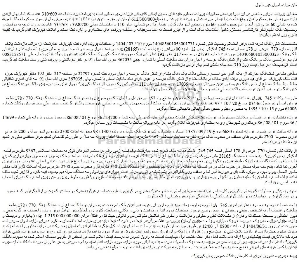 مشخصات ثبتی: ملک تعرفه شده برابر استعلام وضعیت ثبتی شماره 140485601053001731 مورخ 10 / 03 / 1404 و مستندات پرونده اداره ثبت کهریزک عبارتست از: مراتب بازداشت پلاک ثبتی شماره 770 فرعی از 178 اصلی قطعه 745 تفکیکی بخش 12 ناحیه 00 زراعی باغ به مساحت (28165) بیست و هشت هزار و صد و شصت و پنج متر مربع با شماره دفتر بازداشتی الکترونیک 140405801053000323 مورد ثبت شماره 27797 در صفحه 217 دفتر 192 دفاتر کهریزک حوزه ثبت ملک کهریزک مالک آقای محمد داوری دولت آبادی شماره ملی 0083158571 نام پدر مرتضی مالک دو دانگ مشاع از شش دانگ عرصه و اعیان دارای سند مالکیت اصلی با شماره چاپی 367035 سری الف سال 91 در دفتر بازداشتی و پرونده ثبتی و سند مالکیت قید گردیده است. توضیحات : در قبال قیمت روز 310 عدد سکه طلای تمام بهار آزادی بازداشت گردید.