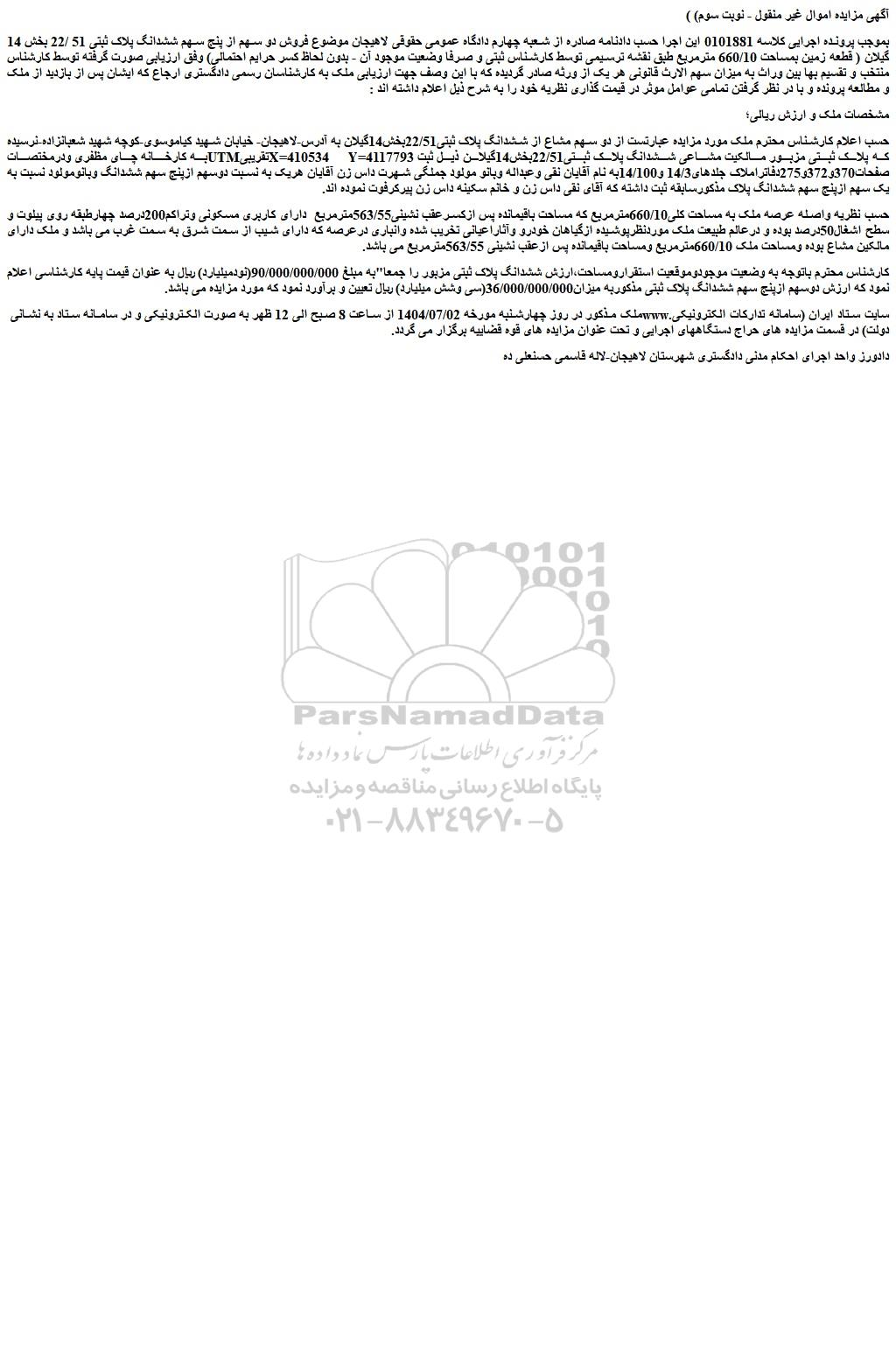 بموجب پرونده اجرایی کلاسه 0101881 این اجرا حسب دادنامه صادره از شعبه چهارم دادگاه عمومی حقوقی لاهیجان موضوع فروش دو سهم از پنج سهم ششدانگ پلاک ثبتی 51 /22 بخش 14 گیلان ( قطعه زمین بمساحت 660/10 مترمربع طبق نقشه ترسیمی توسط کارشناس ثبتی و صرفا وضعیت موجود آن - بدون لحاظ کسر حرایم احتمالی) وفق ارزیابی صورت گرفته توسط کارشناس منتخب و تقسیم بها بین وراث به میزان سهم الارث قانونی هر یک از ورثه صادر گردیده که با این وصف جهت ارزیابی ملک به کارشناسان رسمی دادگستری ارجاع که ایشان پس از بازدید از ملک و مطالعه پرونده و با در نظر گرفتن تمامی عوامل موثر در قیمت گذاری نظریه خود را به شرح ذیل اعلام داشته اند :