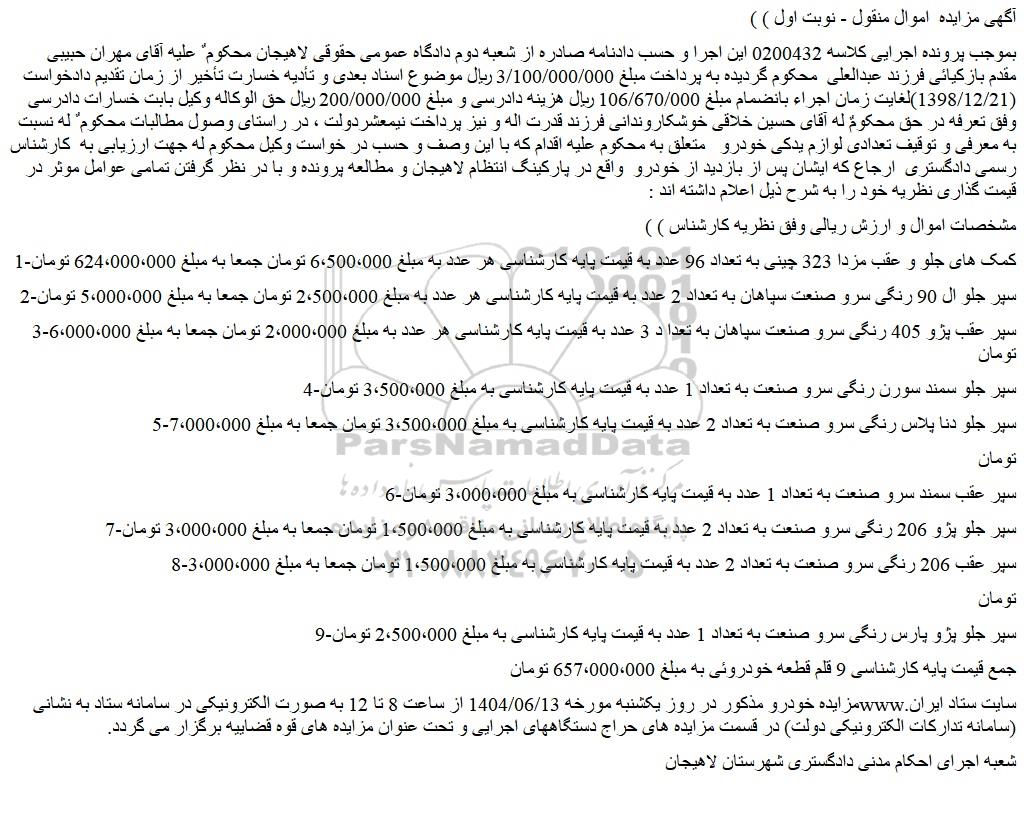 بموجب پرونده اجرایی کلاسه 0200432 این اجرا و حسب دادنامه صادره از شعبه دوم دادگاه عمومی حقوقی لاهیجان محکوم ٌ علیه آقای مهران حبیبی مقدم بازکیائی فرزند عبدالعلی محکوم گردیده به پرداخت مبلغ 3/100/000/000 ریال موضوع اسناد بعدی و تأدیه خسارت تأخیر از زمان تقدیم دادخواست (1398/12/21)لغایت زمان اجراء بانضمام مبلغ 106/670/000 ریال هزینه دادرسی و مبلغ 200/000/000 ریال حق الوکاله وکیل بابت خسارات دادرسی وفق تعرفه در حق محکومٌ له آقای حسین خلاقی خوشکاروندانی فرزند قدرت اله و نیز پرداخت نیمعشردولت ، در راستای وصول مطالبات محکوم ٌ له نسبت به معرفی و توقیف تعدادی لوازم یدکی خودرو متعلق به محکوم علیه اقدام که با این وصف و حسب در خواست وکیل محکوم له جهت ارزیابی به کارشناس رسمی دادگستری ارجاع که ایشان پس از بازدید از خودرو واقع در پارکینگ انتظام لاهیجان و مطالعه پرونده و با در نظر گرفتن تمامی عوامل موثر در قیمت گذاری نظریه خود را به شرح ذیل اعلام داشته اند :