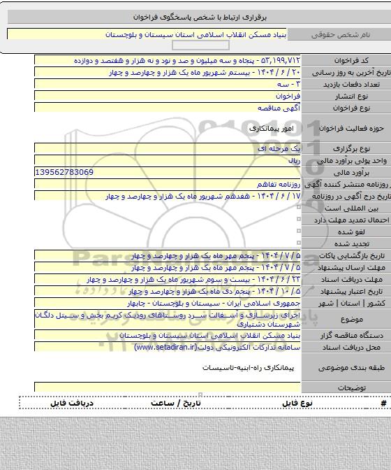 مناقصه اجرای زیرسازی و آسفالت سرد روستاهای رودیک کریم بخش و سیتل دلگان شهرستان دشتیاری از کلیه افراد متخصص و شرکتها واجد شرایط دعوت به عمل میآید در مناقصه با کد خبرگزاری پارس نماد: 9529913 شرکت نمایند.