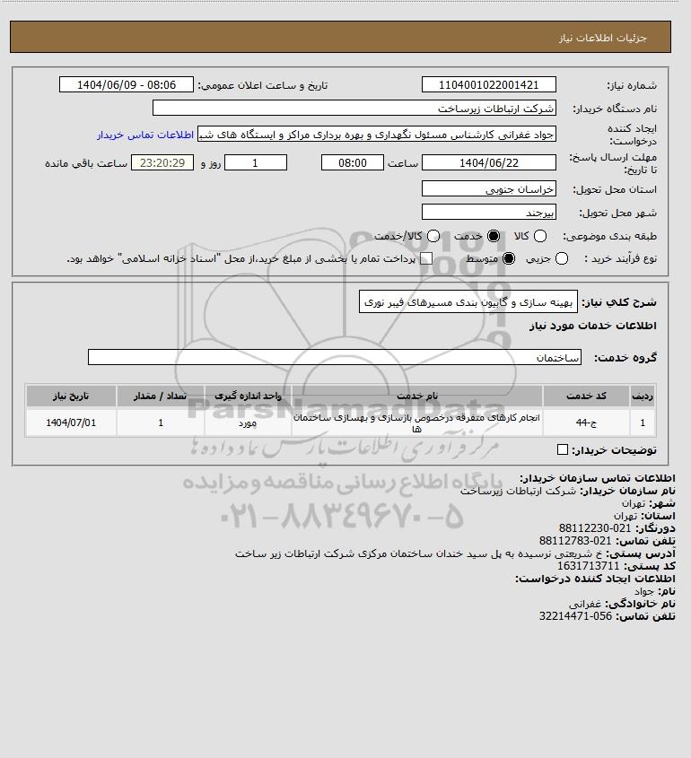 استعلام بها و موضوع استعلام استعلام بهینه سازی و گابیون بندی مسیرهای فیبر نوری به اطلاع کلیه شرکتها و افراد متخصص واجد شرایط میرساند، آگهی گذار در نظر دارد از طریق استعلام بها، نسبت به انتخاب و دریافت پیشنهادات اقدام نماید. این استعلام با کد آگهی ثبت شده در سامانه خبرگزاری پارس نماد : 9530042 منتشر شده است. مشخصات استعلام : تاریخ شروع استعلام: 1404/06/09 آخرین مهلت ارسال پیشنهاد قیمت : 1404/06/22 و محل اجرای پروژه : استان خراسان جنوبی میباشد. استعلام قیمت مورد درخواست : استعلام بهینه سازی و گابیون بندی مسیرهای فیبر نوری با دستهبندیهای تخصصی و گروه های مرتبط : پیمانکاری مخابرات, ساختمان, استعلام اطلاع رسانی میگردد.