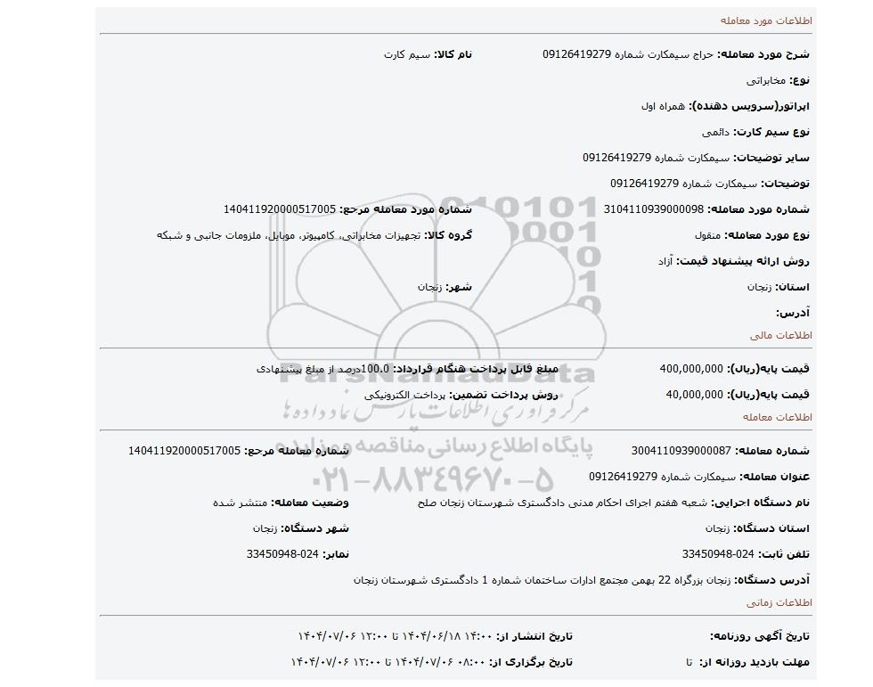 | شرح مورد معامله: حراج سیمکارت شماره 09126419279 | نام کالا: سیم کارت | |