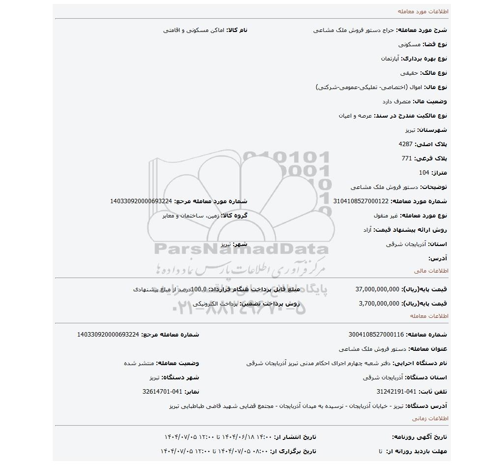 9 مزایده دستور فروش ملک مشاعی 9810687 1404/08/15 new not special not payed آذربایجان شرقی