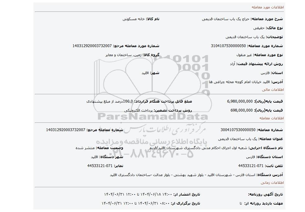 شرح مورد معامله: حراج یک باب ساختمان قدیمینام کالا: خانه مسکونی
