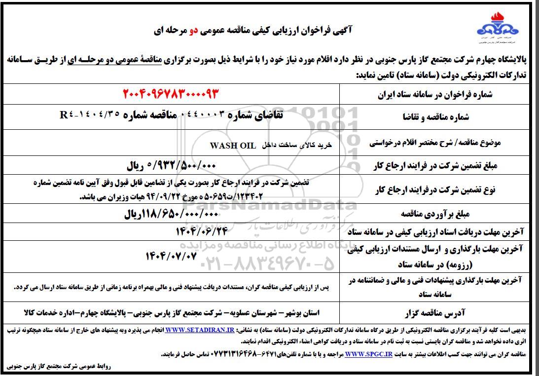 موضوع مناقصه /شرح مختصر اقلام درخواستی : خرید کالای ساخت داخل WASH OIL