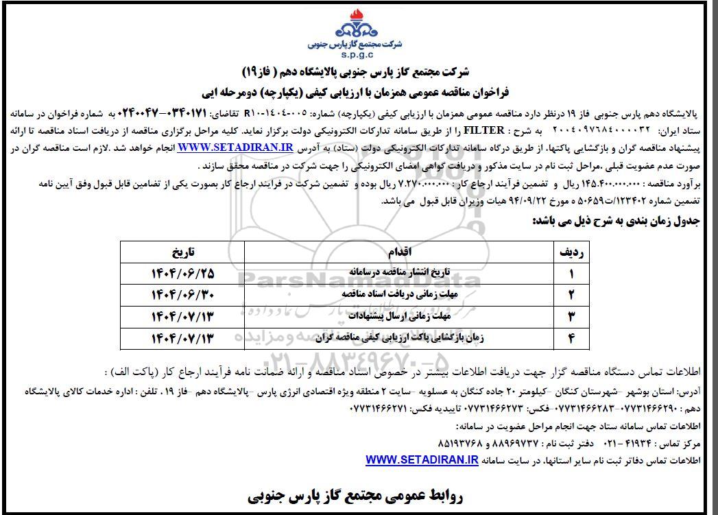 پالایشگاه دهم پارس جنوبی فاز 19 در نظر دارد مناقصه عمومی همزمان با ارزیابی کیفی یکپارچه شماره 14040005-R10 تقاضای 0340171 - 240047 به شماره فراخوان در سامانه ستاد ایران 2004097984000032 به شرح : FILTER را از طریق سامانه تدارکات الکترونیکی دولت برگزار نماید کلیه مراحل برگزاری مناقصه از دریافت اسناد مناقصه تا ارائه پیشنهاد مناقصه گران و بازگشایی پاکتها از طریق درگاه سامانه تدارکات الکترونیکی دولت ستاد به آدرس ستاد ایران انجام خواهد شد . لازم است مناقصه گران در صورت عدم عضویت قبلی مراحل ثبت نام در سایت مذکور و دریافت گواهی امضای الکترونیکی را جهت شرکت در مناقصه محقق سازند .