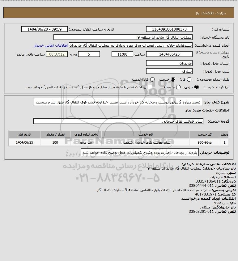 شرح کلی نیاز: ترمیم دیواره گابیونی دربستر رودخانه 15 خرداد رامسر مسیر خط لوله فشر قوی انتقال گاز طبق شرح پیوست