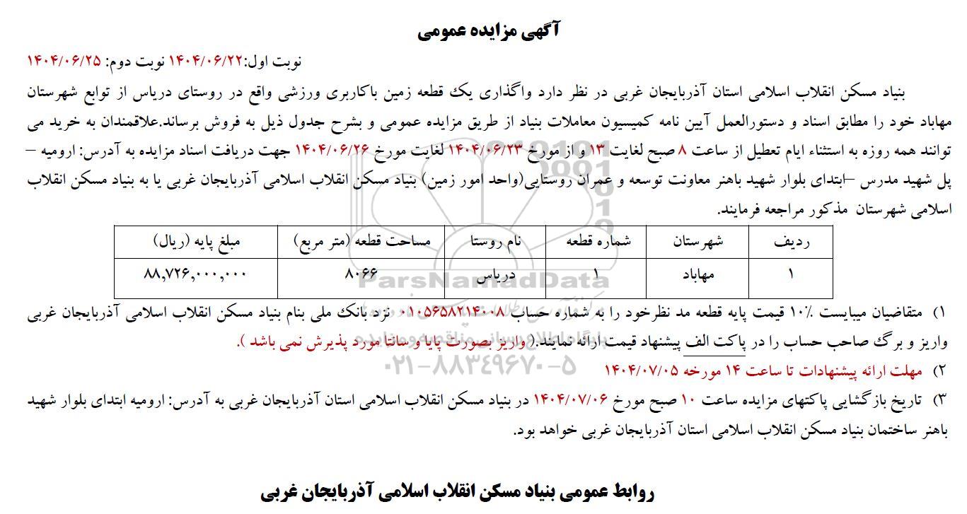 بنیاد مسکن انقلاب اسلامی استان آذربایجان غربی در نظر دارد واگذاری یک قطعه زمین با کاربری ورزشی واقع در روستای دریاس از توابع شهرستان مهاباد خود را مطابق اسناد و دستورالعمل آیین نامه کمیسیون معاملات بنیاد از طریق مزایده عمومی و بشرح جدول ذیل به فروش برساند. علاقمندان به خرید می توانند همه روزه به استثناء ایام تعطیل از ساعت 8 صبح لغایت 13 و از مورخ 1404.06.23 لغایت مورخ 1404.06.26 جهت دریافت اسناد مزایده به آدرس ارومیه -پل شهید مدرس ابتدای بلوار شهید باهنر معاونت توسعه و عمران روستایی واحد امور زمین بنیاد مسکن انقلاب اسلامی آذربایجان غربی یا به بنیاد مسکن انقلاب اسلامی شهرستان مذکور مراجعه فرمایند.