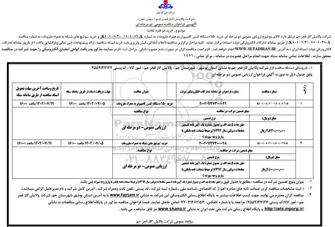 شرکت پالایش گاز فجر جم در نظر دارد کالای موضوع فراخوان عمومی دو مرحله ای خرید 150 دستگاه کیس کامپیوتر به همراه ملزومات به شماره K40408-3001804046-A و سوئیچ های شبکه به همراه ملزومات به شماره مناقصه K40407-3104804038-A از طریق سامانه تدارکات الکترونیکی دولت (ستاد) برگزار نماید. کلیه مراحل برگزاری مناقصه اعلام آمادگی فیش واریزی بابت خرید اسناد مناقصه ارائه پیشنهادات فنی مالی و بازگشایی پاکات از طریق سامانه تدارکات الکترونیکی دولت ستاد ایران) به آدرس : ستاد ایران انجام خواهد شد. لازم است مناقصه گران در صورت عدم عضویت قبلی ، مراحل ثبت نام در سایت مذکور و دریافت گواهی امضای الکترونیکی را جهت شرکت در مناقصه محقق سازند. اطلاعات تماس سامانه ستاد جهت انجام مراحل عضویت در سامانه ، مرکز تماس : 1456