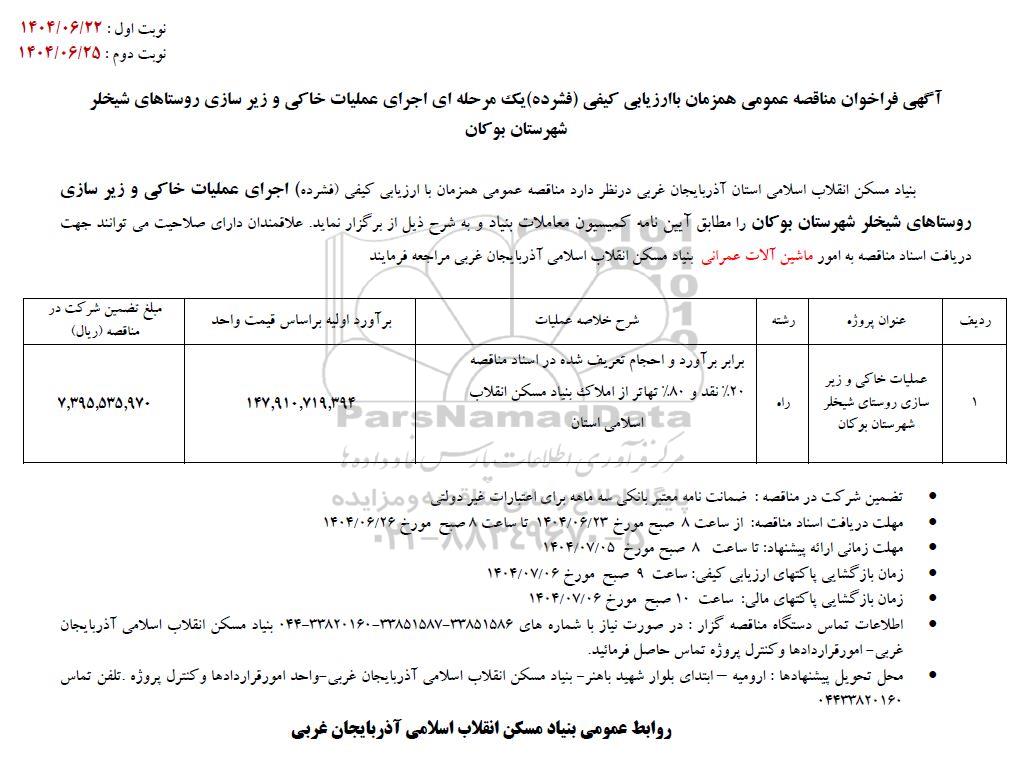 | 1 | اجرای عملیات خاکی و زیرسازی روستاهای شیخلر شهرستان بوکان | راه | برابر برآورد و احجام تعریف شده در اسناد مناقصه %20 نقد و 80 درصد تهاتر از املاک بنیاد مسکن استان | 147.910.719.394 | 7.395.535.970 |