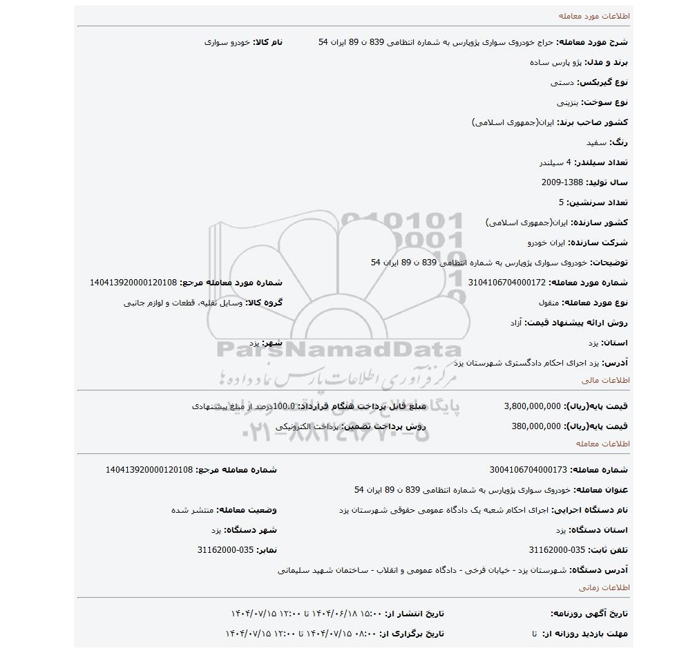 | عنوان معامله: خودروی سواری پژوپارس به شماره انتظامی 839 ن 89 ایران 54 | ||