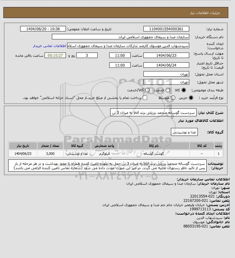 شرح کلی نیاز: سردست گوساله منجمد برزیلی برند pul به میزان 3 تن