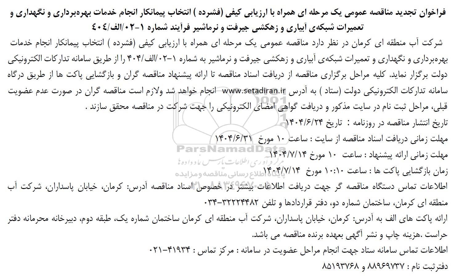 شرکت آب منطقه ای کرمان در نظر دارد مناقصه عمومی یک مرحله ای همراه با ارزیابی کیفی (فشرده) انتخاب پیمانکار انجام خدمات بهره برداری و نگهداری و تعمیرات شبکه ی آبیاری و زهکشی جیرفت و نرماشیر به شماره 1-02/ الف / 404 را از طریق سامانه تدارکات الکترونیکی دولت برگزار نماید.