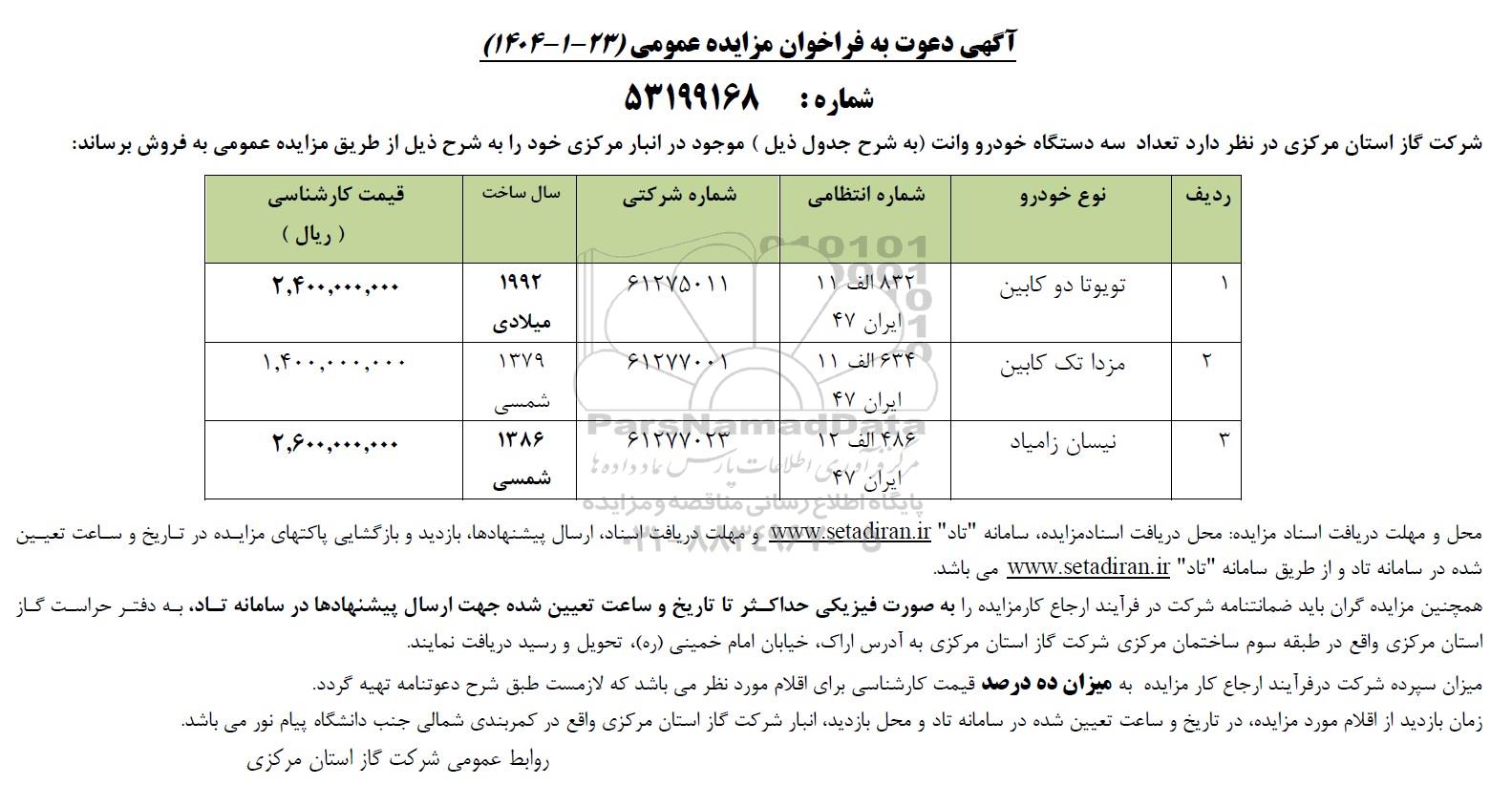 شرکت گاز استان مرکزی در نظر دارد تعداد سه دستگاه خودرو وانت ( به شرح جدول ذیل ) موجود در انبار مرکزی خود را به شرح ذیل از طریق مزایده عمومی به فروش برساند