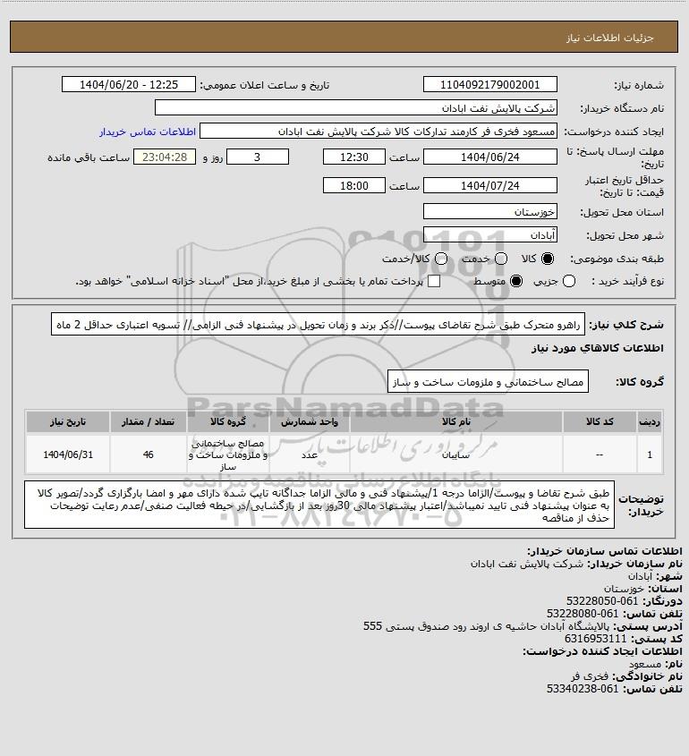 استعلام بها و موضوع استعلام استعلام راهرو متحرک طبق شرح تقاضای پیوست//ذکر برند و زمان تحویل در پیشنهاد فنی الزامی// تسویه اعتباری حداقل 2 ماه به اطلاع کلیه شرکتها و افراد متخصص واجد شرایط میرساند، آگهی گذار در نظر دارد از طریق استعلام بها، نسبت به انتخاب و دریافت پیشنهادات اقدام نماید. این استعلام با کد آگهی ثبت شده در سامانه خبرگزاری پارس نماد : 9531364 منتشر شده است. مشخصات استعلام : تاریخ شروع استعلام: 1404/06/20 آخرین مهلت ارسال پیشنهاد قیمت : 1404/06/24 و محل اجرای پروژه : استان خوزستان میباشد. استعلام قیمت مورد درخواست : استعلام راهرو متحرک طبق شرح تقاضای پیوست//ذکر برند و زمان تحویل در پیشنهاد فنی الزامی// تسویه اعتباری حداقل 2 ماه با دستهبندیهای تخصصی و گروه های مرتبط : انواع پوشش سقف ساختمان, سازه های فلزی و فضایی, مصالح ساختمانی, استعلام اطلاع رسانی میگردد.