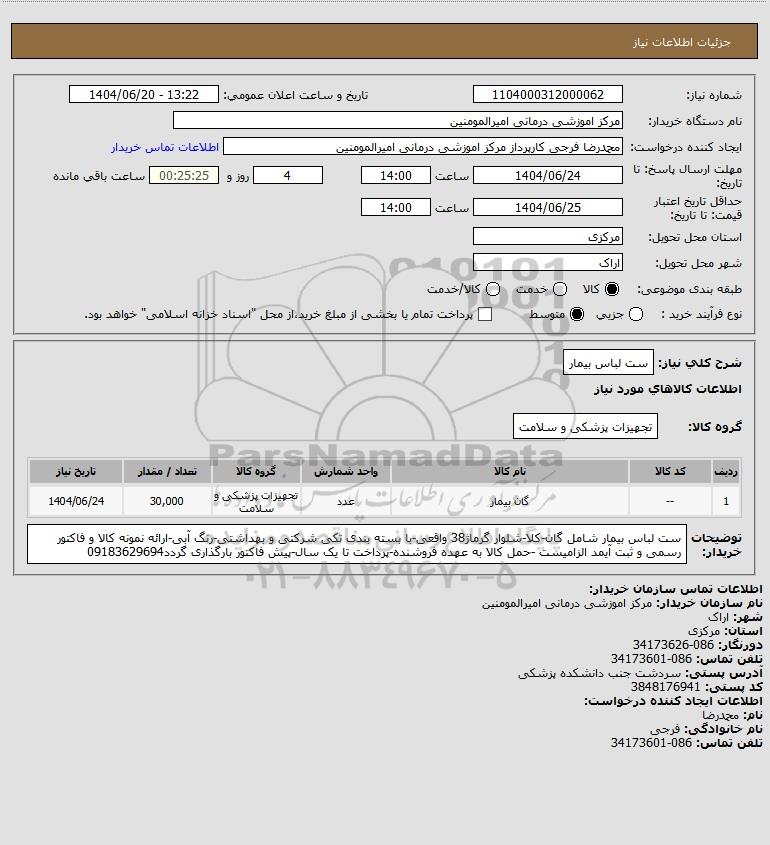 | 1 | -- | گان بیمار | عدد | تجهیزات پزشکی و سلامت | 30,000 | 1404/06/24 |
