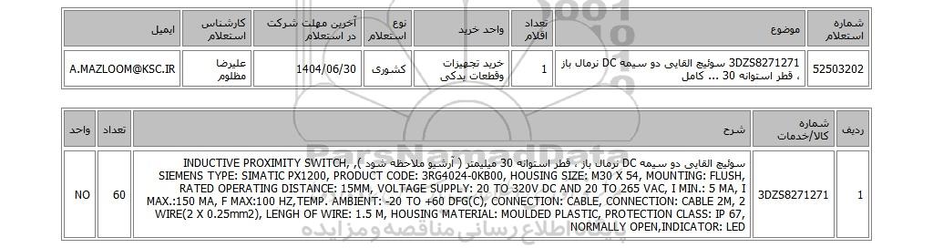 | 52503202 | 3DZS8271271 سوئیچ القایی دو سیمه DC نرمال باز ، قطر استوانه 30 ... کامل | 1 | خرید تجهیزات وقطعات یدکی | کشوری | 1404/06/30 | علیرضا مظلوم | A.MAZLOOM@KSC.IR |