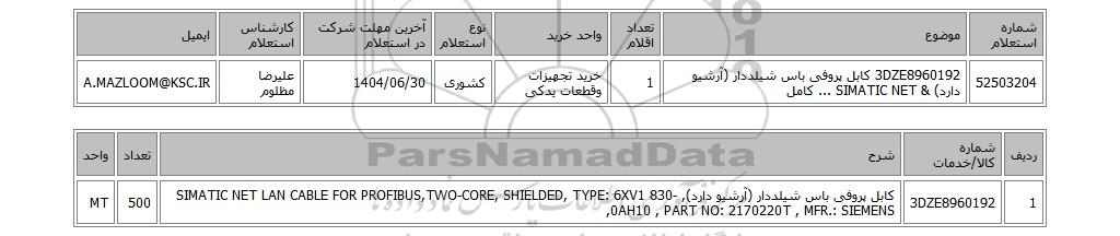 | 52503204 | 3DZE8960192 کابل پروفی باس شیلددار (آرشیو دارد) & SIMATIC NET ... کامل | 1 | خرید تجهیزات وقطعات یدکی | کشوری | 1404/06/30 | علیرضا مظلوم | A.MAZLOOM@KSC.IR |