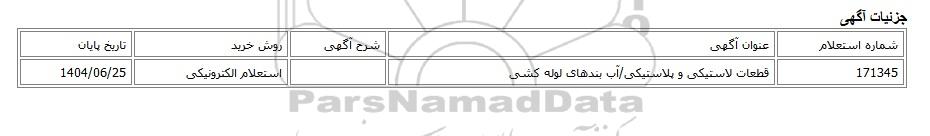 | 171345 | قطعات لاستیکی و پلاستیکی/آب بندهای لوله کشی | استعلام الکترونیکی | 1404/06/25 |