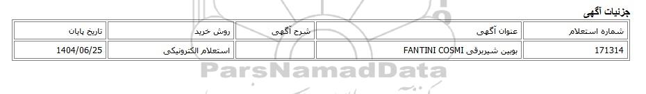 | 171314 | بوبین شیربرقی FANTINI COSMI | استعلام الکترونیکی | 1404/06/25 |