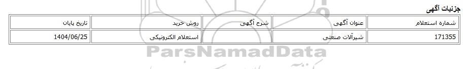 | 171355 | شیرآلات صنعتی | استعلام الکترونیکی | 1404/06/25 |