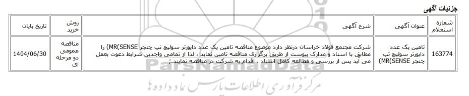 | 163774 | تامین یک عدد دایورتر سوئیچ تپ چنجر MR(SENSE) | شرکت مجتمع فولاد خراسان درنظر دارد موضوع مناقصه تامین یک عدد دایورتر سوئیچ تپ چنجر MR(SENSE) را مطابق با اسناد و مدارک پیوست از طریق برگزاری مناقصه تامین نماید ، لذا از تمامی واجدین شرایط دعوت بعمل می آید پس از بررسی و مطالعه کامل اسناد ، اقدام به شرکت در مناقصه نمایند.; | مناقصه عمومی دو مرحله ای | 1404/06/30 |