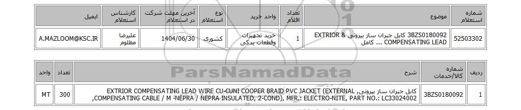 | 1 | 3BZS0180092 | کابل جبران ساز بیرونی, EXTRIOR COMPENSATING LEAD WIRE CU-CUNI COOPER BRAID PVC JACKET (EXTERNAL COMPENSATING CABLE / M -NEPRA / NEPRA INSULATED, 2-COND), MFR.: ELECTRO-NITE, PART NO.: LC33024002, | 300 | MT |