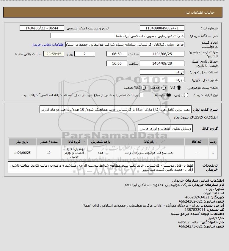 | 1 | -- | پمپ سوخت خودروی سواری یا وانت | عدد | وسایل نقلیه، قطعات و لوازم جانبی | 10 | 1404/06/25 |