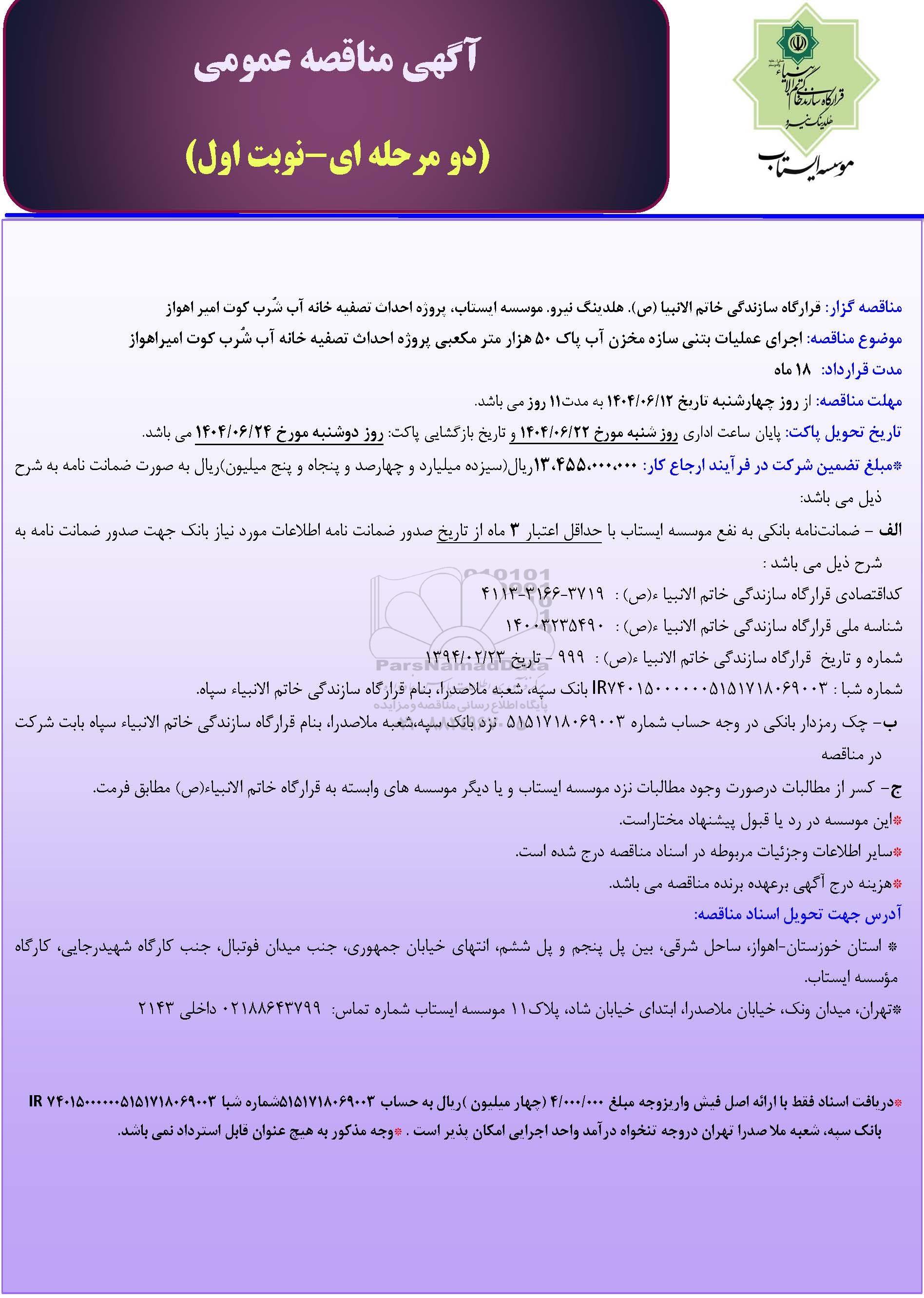مناقصه گزار : قرارگاه سازندگی خاتم الانبیا (ص) - هلدینگ تخصصی نیرو، موسسه ایستاب، پروژه احداث تصفیه خانه آب شرب کوت امیر اهواز