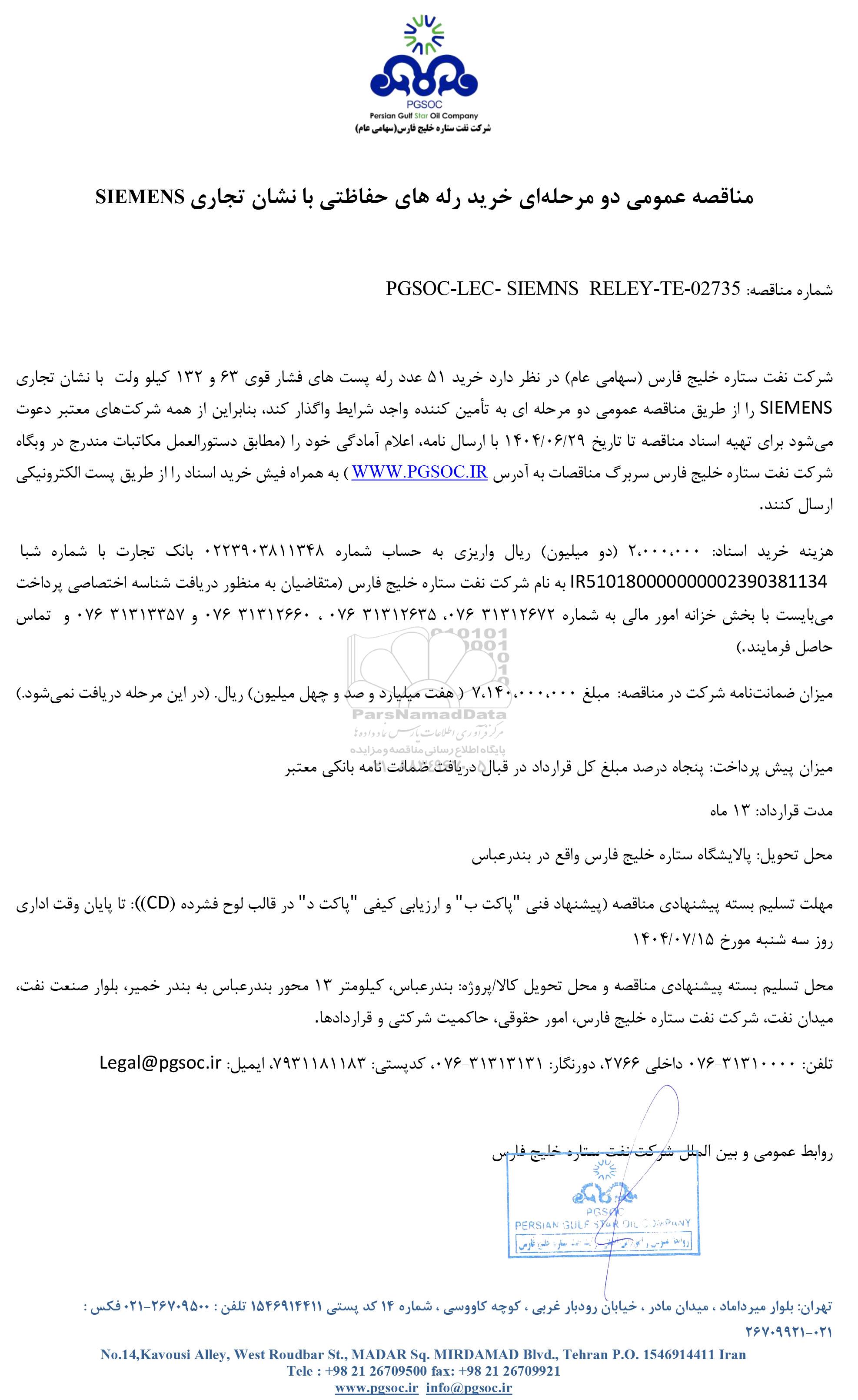 شماره مناقصه: PGSOC-LEC- SIEMNS RELEY-TE- 02735