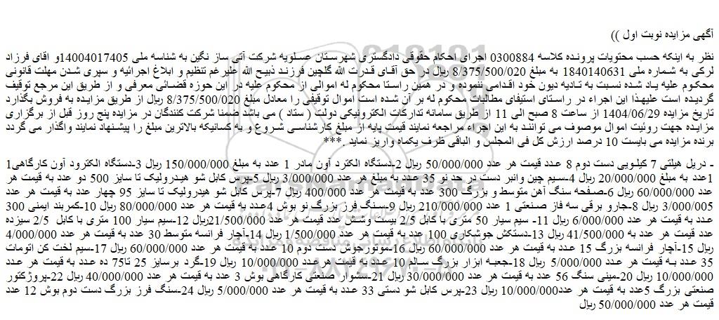 نظر به اینکه حسب محتویات پرونده کلاسه 0300884 اجرای احکام حقوقی دادگستری شهرستان عسلویه شرکت آتی ساز نگین به شناسه ملی 14004017405و اقای فرزاد لرکی به شماره ملی 1840140631 به مبلغ 8/375/500/020 ریال در حق آقای قدرت الله گلچین فرزند ذبیح الله علیرغم تنظیم و ابلاغ اجرائیه و سپری شدن مهلت قانونی محکوم علیه یاد شده نسبت به تادیه دیون خود اقدامی ننموده و در همین راستا محکوم له اموالی از محکوم علیه در این حوزه قضائی معرفی و از طریق این مرجع توقیف گردیده است علیهذا این اجراء در راستای استیفای مطالبات محکوم له بر آن شده است اموال توقیفی را معادل مبلغ 8/375/500/020 ریال از طریق مزایده به فروش بگذارد تاریخ مزایده 1404/06/29 از ساعت 8 صبح الی 11 از طریق سامانه تدارکات الکترونیکی دولت ( ستاد ) می باشد ضمنا شرکت کنندگان در مزایده پنج روز قبل از برگزاری مزایده جهت روئیت اموال موصوف می توانند به این اجراء مراجعه نمایند قیمت پایه از مبلغ کارشناسی شروع و به کسانیکه بالاترین مبلغ را پیشنهاد نمایند واگذار می گردد برنده مزایده می بایست 10 درصد ارزش کل فی المجلس و الباقی ظرف یکماه واریز نماید .***
