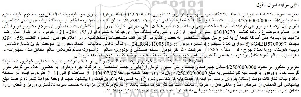 احتراما بموجب دادنامه صادره از شعبه 21دادگاه عمومی تهران و در پرونده اجرایی کلاسه 0304270 له زهرا شهبازی خو علیه رحمت اله تقی پور محکوم علیه محکوم است به پرداخت 4/250/000/000 ریال یکدستگاه وسیله نقلیه شماره انتظامی ایران 55/ 294م 24 متعلق به خانم مهین رضا نتاج و بوسیله کارشناس رسمی دادگستری بشرح ذیل توصیف و ارزیابی گردیده است. به استحضار می رساند اینجانب سرهنگ2 علی مهرابی کارشناس رسمی دادگستری حسب دستور آن مرجع محترم و در راستای قرار صادره موضوع پرونده کلاسه 03040270 مبنی بر تعیین ارزش واقعی یک دستگاه سواری هیوندا به شماره ایران 55/ 294 م 24 ازخودرو ، در بلوار امام رضا بازدید بازدید به عمل آمد که نتیجه آن به شرح ذیل جهت استحضار به حضور تقدیم می گردد. الف مشخصات وسائط نقلیه برابر اعلام خواهان : شماره انتظامی:55/ 294م 24 رنگ: ذغالی -متالیک تعداد محور: 2 سوخت: بنزین شماره شاسی ir84311005103 :نوع: سواری تعداد سیلندر: 4 شماره موتور : g4eb5700097 سیستم وتیپ: هیوندا- ورنا تعداد چرخ : 4 مدل: 1385 ظرفیت : 4 نفر موتور: سالم صندلی و تودوزی: سالم داشبورد: سالم گیربکس: سالم مطابق مدل تجهیزات: - دیفرانسیل: سالم تایرها:کامل نود درصد نقایص ظاهری از قبیل :دور رنگ-رنگ سقف آفتاب سوخته-کف صندوق با سابقه خوردگی اعلام نظریه: با توجه به مدل خودرو و وضعیت ظاهری و فنی در هنگام بازدید و با توجه به بازار خودرو، قیمت پایه خودرو مذکور در حدود 4/250/000/000معادل چهارصد و بیست و پنج میلیون تومان ارزیابی و جهت استحضار و هرگونه بهره برداری به حضور اعلام می گردد. مقرر گردید خودروی فوق با قیمت پایه کارشناسی به مبلغ 4/250/000/0000 ریال در روز چهارشنبه مورخه 1404/07/02 از ساعت 8 الی 11 از طریق مزایده در سامانه الکترونیک تدارکات دولت (ستاد) بفروش برسد. مزایده از قیمت پایه کارشناسی شروع و به کسی که بالاترین قیمت را پیشنهاد نماید فروخته خواهد شد. ده درصد مبلغ پیشنهادی فی المجلس از خریدار اخذ و مابقی ثمن را خریدار مکلف است حداکثر ظرف مهلت یکماه از تاریخ برگزاری مزایده به حساب سپرده دادگستری واریز و قبض آن را به این اجراء تحویل نماید در غیر اینصورت ده درصد دریافتی به نفع دولت ضبط و مراسم مزایده تجدید خواهد شد.