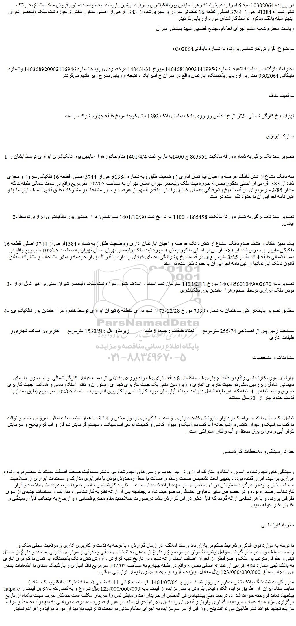 در پرونده 0302064 شعبه 6 اجرا به درخواسته زهرا عابدین پورنالکیاشری بطرفیت نوشین یاربخت به خواسته دستور فروش ملک مشاع به پلاک ثبتی شماره 1384فرعی از 3744 اصلی قطعه 16 تفکیکی مفروز و مجزی شده از 383 فرعی از اصلی مذکور بخش 3 حوزه ثبت ملک ولیعصر تهران بدینوسیله پلاک مذکور توسط کارشناس مورد ارزیابی گردید.