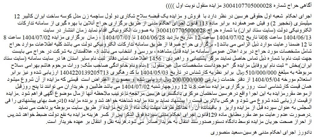 اجرای احکام  شعبه اول حقوقی هرسین در نظر دارد با  فروش و مزایده یک قبضه سلاح شکاری دو لول ساچمه زن مدل کوسه ساخت ایران کالیبر 12 میلیمتری (نخجیر 2) و فیش عمرهمفرده  برابر ماده 113 قانون اجرای احکام مدنی از طریق برگزاری حراج آنلاین با بهره گیری از سامانه تدارکات الکترونیکی دولت (سایت ستاد ایران) با شماره حراج 3004107705000028  به صورت الکترونیکی اقدام نماید زمان انتشار در سایت 1404/06/13 ساعت 08تا تاریخ 1404/07/02 ساعت 12 ،تاریخ بازدید 1404/06/28 تا 1404/07/01 ، زمان  برگزاری مزایده 1404/07/02 ساعت 8 تا 12 ضمنا رعایت موارد ذیل الزامی می باشد1- برگزاری حراج صرفا از طریق سامانه تدارکات الکترونیکی دولت می باشد کلیه اطلاعات موارد حراج شامل مشخصات مورد حراج در برد اعلان عمومی سامانه مزایده قابل مشاهده ، بررسی و انتخاب می باشد 3- علاقمندان به شرکت در حراج می بایست جهت ثبت نام با شماره ذیل تماس حاصل نمایند مرکز پشتیبانی و راهبردی : 1456 اطلاعات تماس دفاتر ثبت نام سایر استان ها در سایت سامانه (سایت ستاد ایران)بخش " ثبت نام /پروفایل مزایده گر "موجوداست مشخصات مال غیرمنقول: 1-نام ونام خانوادگی صاحب ملک: وراث مرحوم هاشم بهرامی ،سلاح مربوطه به مبلغغ 510/000/000 ریال  برابر نظریه کارشناس در تاریخ 1404/05/03 با کد رهگیری 1404220139205713 ارزیابی شده و نیز برابر استعلام مورخه 1404/05/04 از دفتر خدمات زیارتی 200/000/000 ریال ارزیابی شده  و مصون از اعتراض است  قیمتی که مزایده از آن شروع میشود همان قیمت کارشناسی است  روز برگزاری مزایده ساعت 8 تا 12 روزچهارشنبه 1404/07/02 می باشد طالبین و خریداران می توانند تا پنج روزقبل ازموعد مقررمزایده به این اجرا واقع درهرسین ساختمان مرکزی دادگستری هرسین مراجعه تا ترتیب ملاحظه آنها ازمال موضوع آگهی فراهم شود .مزایده ازقیمت ارزیابی شده شروع می شود و هرکس بالاترین قیمت را پیشنهاد نماید برنده مزایده شناخته خواهد شد و برنده مزایده 10درصد بهای پیشنهادی را فی المجلس به عنوان سپرده قبل از مزایده واریز  و باقیمانده آن را حداکثرظرف مهلت یک ماه ازتاریخ مزایده از طریق سایت مربوطه پرداخت می نماید .درصورت عدم رعایت موعد مقررمطابق ماده 129قانون اجرای احکام مدنی سپرده فوق الذکر پس از کسر هزینه مزایده به نفع دولت ضبط خواهد شد.پس از احراز صحت جریان مزایده توسط دادگاه دستورصدورسند انتقال به خریدارصادر می شود.هزینه نقل و انتقال بر عهده خریدار است.