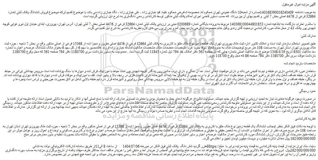 به موجب دادنامه  140168390016240409صادره از شعبه10 دادگاه عمومی تهران محکوم له: معصومه شاهرخی محکوم علیه: محمد خبازی زاده - علی خبازی زاده - نگاه خبازی زاده می باشد با موضوع تقسیم ترکه موضوع فروش ششدانگ پلاک ثبتی شماره 32664 فرعی از 4476 اصلی بخش 7 ثبتی  و تقسیم بهای آن بین وراث  که حسب دستور قاضی اجرای احکام پلاک ثبتی مذکور توسط کارشناس رسمی دادگستری به شرح ذیل ارزیابی گردیده است