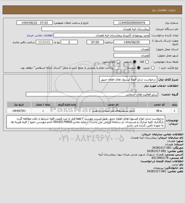 2 استعلام شارژ کپسول های آتش نشانی طبق فایل پیوست 9810718 1404/08/15 new not special not payed قزوین