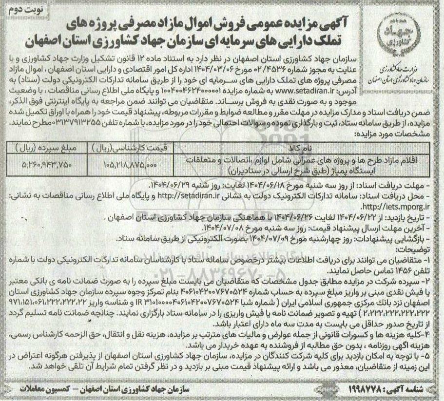 سازمان جهاد کشاورزی استان اصفهان در نظر دارد به استناد ماده 12 قانون تشکیل وزارت جهاد کشاورزی و با عنایت به مجوز شماره 02/4536 مورخ 1404.03.06 اداره کل امور اقتصادی و دارایی استان اصفهان ، اموال مازاد مصرفی پروژه های تملک دارایی های سرمایه ای خود را از طریق سامانه تدارکات الکترونیکی دولت (ستاد) به شماره مزایده 1004004624000001 و پایگاه ملی اطلاع رسانی مناقصات، با وضعیت موجود و به صورت نقدی به فروش برساند. متقاضیان میتوانند ضمن مراجعه به پایگاه اینترنتی فوق الذکر، ضمن دریافت اسناد و مدارک مزایده در مهلت مقرر و مطالعه ضوابط و مقررات مربوطه پیشنهاد قیمت خود را همراه با اوراق تکمیل شده مزایده از طریق سامانه ستاد ثبت و بارگذاری نموده و سوالات احتمالی خود را در مورد مزایده با شماره تلفن 03137913255 مطرح نمایند.