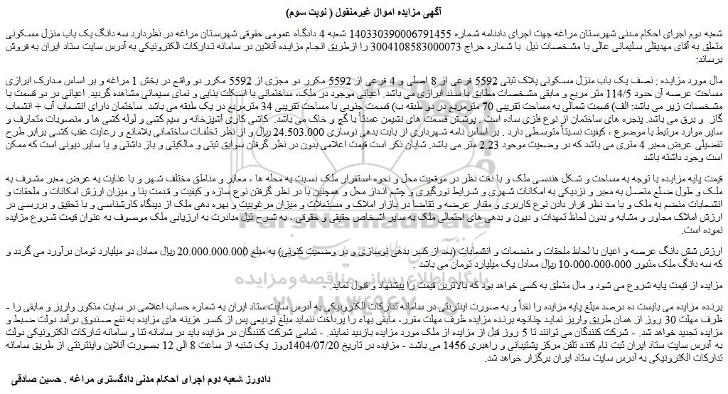 شعبه دوم اجرای احکام مدنی شهرستان مراغه جهت اجرای دادنامه شماره 140330390006791455 شعبه 4 دادگاه عمومی حقوقی شهرستان مراغه در نظردارد سه دانگ یک باب منزل مسکونی متعلق به آقای مهدیقلی سلیمانی عالی با مشخصات ذیل  با شماره حراج 3004108583000073 را ازطریق انجام مزایده آنلاین در سامانه تدارکات الکترونیکی به آدرس سایت ستاد ایران به فروش برساند:
