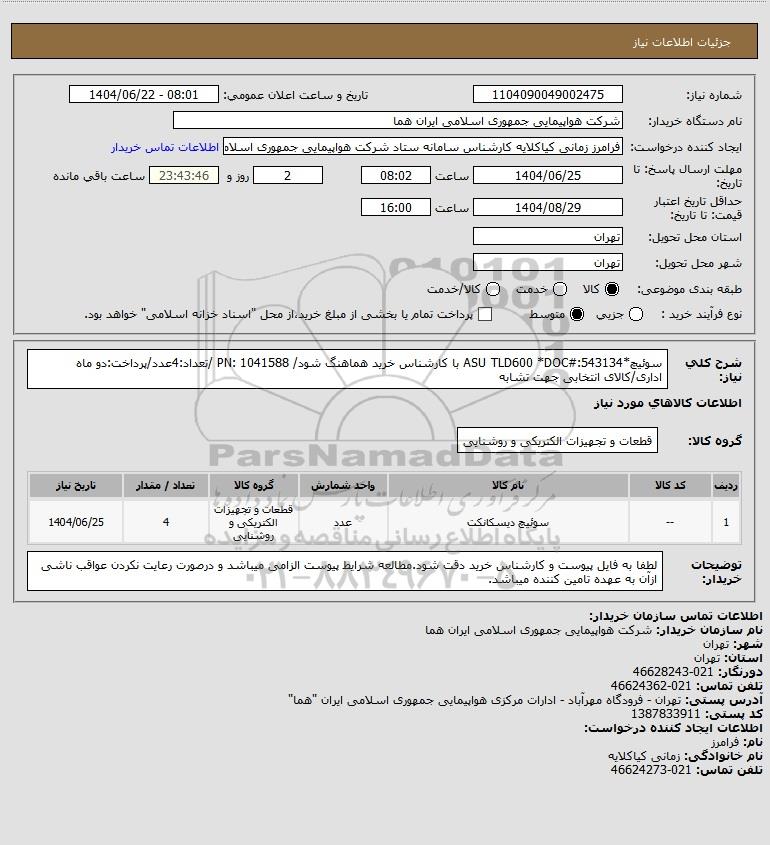 استعلام بها و موضوع استعلام استعلام سوئیچ*ASU TLD600 *DOC#:543134 با کارشناس خرید هماهنگ شود/ PN: 1041588 /تعداد:4عدد/پرداخت:دو ماه اداری/کالای انتخابی جهت تشابه به اطلاع کلیه شرکت‌ها و افراد متخصص واجد شرایط می‌رساند، آگهی گذار در نظر دارد از طریق استعلام بها، نسبت به انتخاب و دریافت پیشنهادات اقدام نماید. این استعلام با کد آگهی ثبت شده در سامانه خبرگزاری پارس نماد : 9532522 منتشر شده است. مشخصات استعلام : تاریخ شروع استعلام: 1404/06/22 آخرین مهلت ارسال پیشنهاد قیمت : 1404/06/25 و محل اجرای پروژه : استان تهران میباشد. استعلام قیمت مورد درخواست : استعلام سوئیچ*ASU TLD600 *DOC#:543134 با کارشناس خرید هماهنگ شود/ PN: 1041588 /تعداد:4عدد/پرداخت:دو ماه اداری/کالای انتخابی جهت تشابه با دسته‌بندی‌های تخصصی و گروه های مرتبط : ابزار دقیق, انواع کلید و پریزهای برقی و صنعتی, کلیه خدمات و تامین تجهیزات صنایع هوایی, تجهیزات برق و الکترونیک, استعلام اطلاع رسانی میگردد.