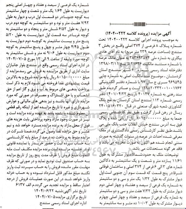 مزایده فروش شماره پلاک 8 فرعی از 374 اصلی واقع در بخش 3 سنندج (مساحت عرصه 239 متر مربع)