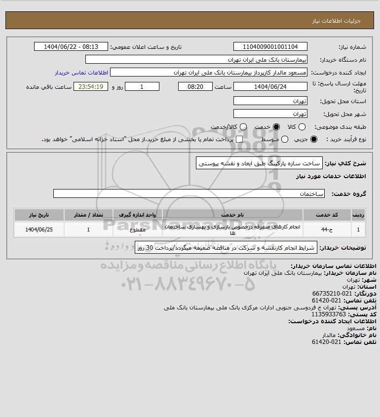 شرح کلی نیاز: ساخت سازه پارکینگ طبق ابعاد و نقشه پیوستی
