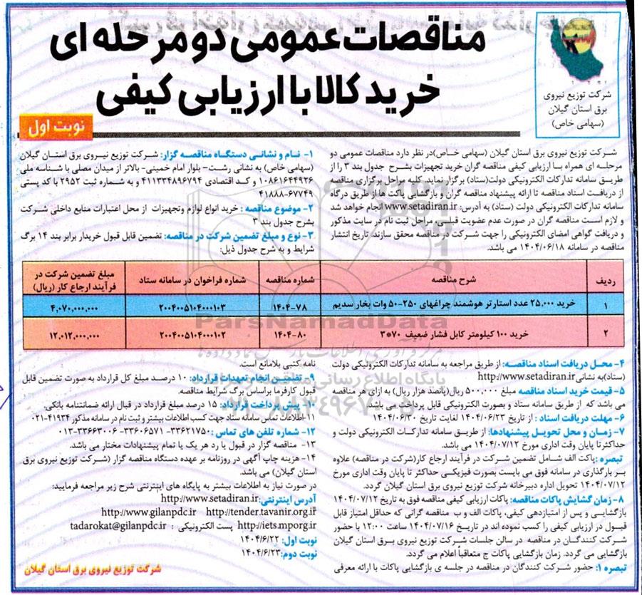 شرکت توزیع نیروی برق استان گیلان (سهامی خاص) در نظر دارد مناقصات عمومی دو مرحله ای همراه با ارزیابی کیفی مناقصه گران خرید تجهیزات بشرح جدول بند 3 را از طریق سامانه تدارکات الکترونیکی دولت (ستاد) برگزار نماید. کلیه مراحل برگزاری مناقصه از دریافت اسناد مناقصه تا ارائه پیشنهاد مناقصه گران و بازگشایی پاکت ها از طریق درگاه سامانه تدارکات الکترونیکی دولت (ستاد) به آدرس ستاد ایران انجام خواهد شد و لازم است مناقصه گران در صورت عدم عضویت قبلی مراحل ثبت نام در سایت مذکور و دریافت گواهی امضای الکترونیکی را جهت شرکت در مناقصه محقق سازند. تاریخ انتشار مناقصه در سامانه 1404.06.18 می باشد.