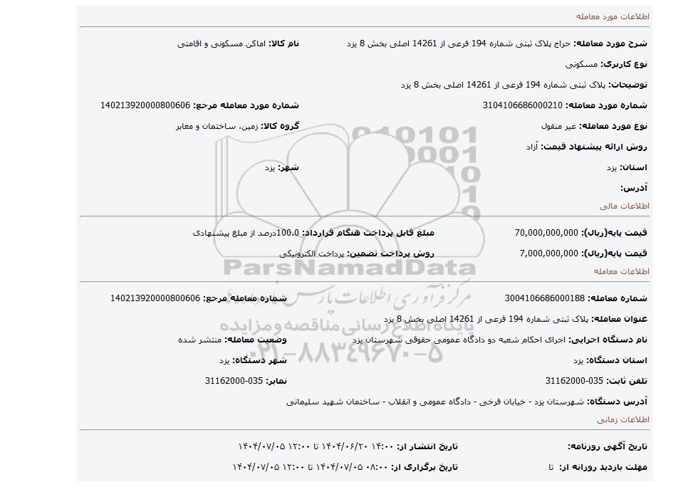 | شرح مورد معامله: حراج پلاک ثبتی شماره 194 فرعی از 14261 اصلی بخش 8 یزد | نام کالا: اماکن مسکونی و اقامتی | |