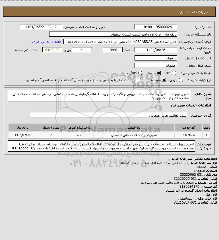 شرح کلی نیاز: تامین نیروی انسانی وخدمات جهت سرویس و نگهداری موتورخانه های گرمایشی شعب بانکملی درسطح استان اصفهان طبق مشخصات و لیست پیوست