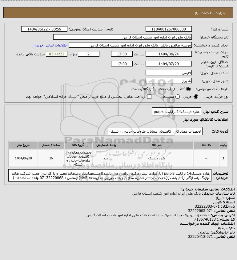 توضیحات خریدار:هارد دیسک14 ترابایت purple (بارگذاری پیش فاکتور الزامی می باشد)(مشخصات:از برندهای معتبر و با گارانتی معتبر شرکت های آواژنگ یاسازگار ارقام باشد)(جهت نصب در ذخیره ساز دیجیتال دوربین مداربسته NVR) (تماس : 07132220068 واحد ساختمان )