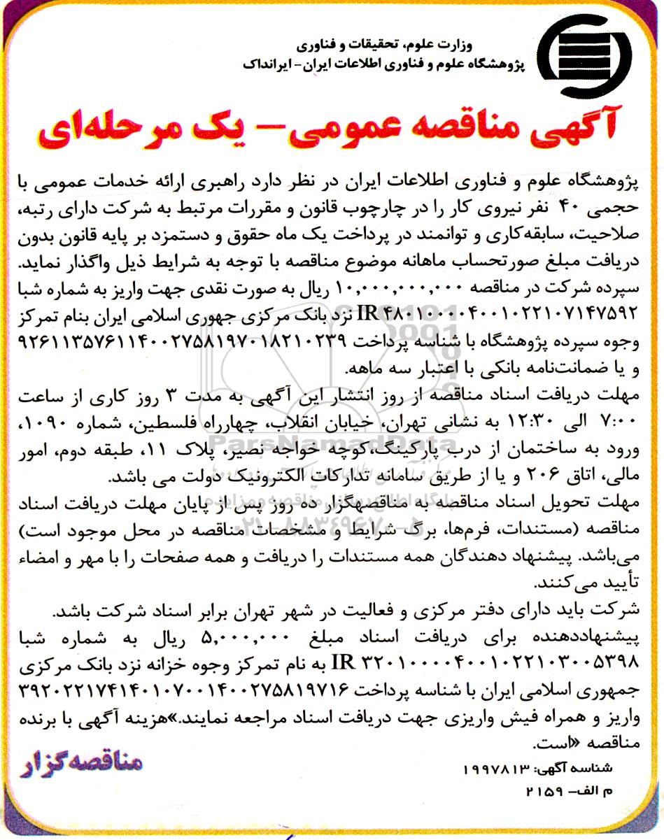 پژوهشگاه علوم و فناوری اطلاعات ایران در نظر دارد راهبری ارائه خدمات عمومی با حجمی 40 نفر نیروی کار را در چارچوب قانون و مقررات مرتبط به شرکت دارای رتبه صلاحیت سابقه کاری و توانمند در پرداخت یک ماه حقوق و دستمزد بر پایه قانون بدون دریافت مبلغ صورتحساب ماهانه موضوع مناقصه با توجه به شرایط ذیل واگذار نماید.